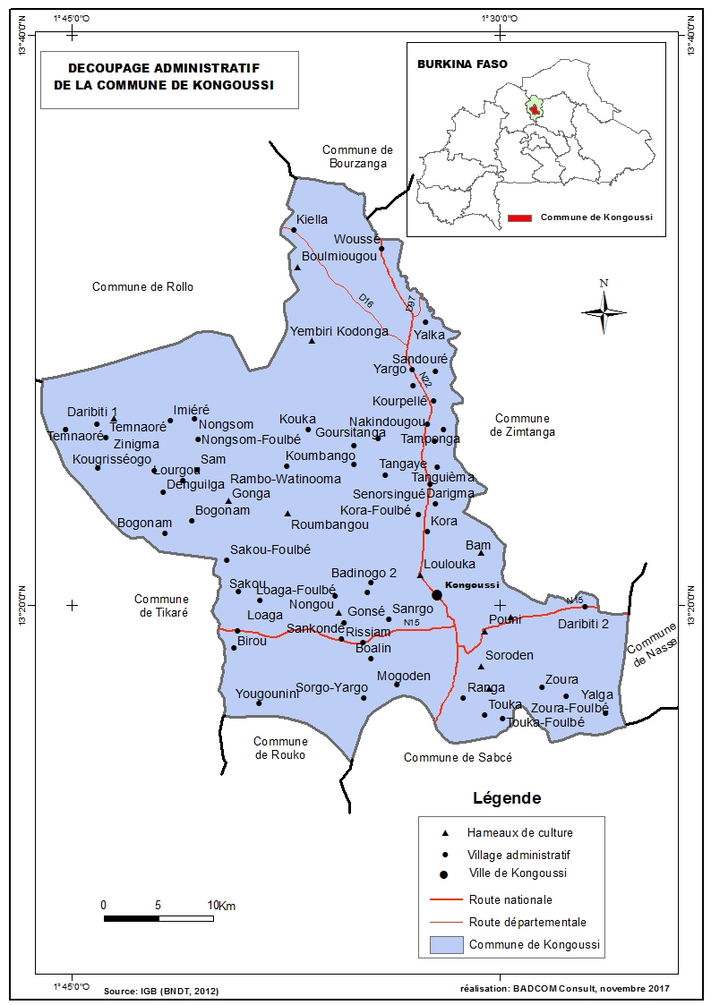 La commune urbaine de Kongoussi est située à 110 Km de Ouagadougou, capitale du Burkina Faso. Cette commune est située entre les coordonnées 1°45’60’’et 1°25’39’’ de longitude Ouest et entre